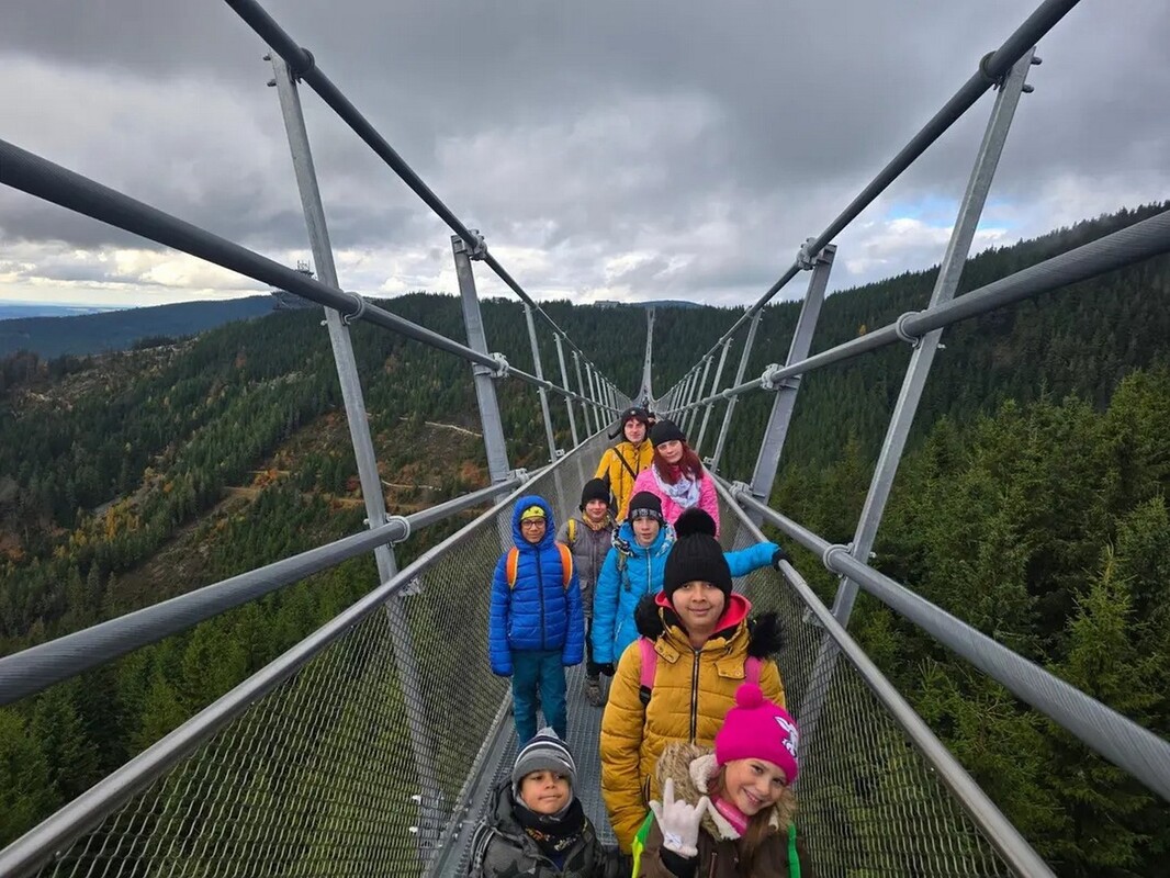 Jedním z vrcholů našeho pobytu, byl celodenní výlet na Dolní Moravu – do hor zážitků. Lanovkou jsme vyjeli na horu Sněžník, kde jsme si pochutnali na výborném obědě v restauraci Skalka. Poté jsme se vydali na známou Stezku v oblacích, odkud se nám otevřely dech beroucí výhledy na hory a celé okolí. Odtud jsme zahlédli i visutý most Sky Bridge721, na který jsme se velmi těšili. Hlavně tety. Přechod přes 721metrů dlouhý most nad horským údolím byl pro všechny velkým zážitkem. Po návratu ze stezky, nás čekalo další dobrodružství – jízda na mamutí horské dráze. Deset minut na bobech z hory Sněžník nám dodalo dávku adrenalinu i smíchu.