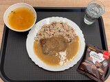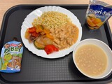 Polévka z bílých fazolí, krůtí nudličky, tříbarevný perlový kuskus, grilovaná zelenina, pudinková kapsička, džusík.