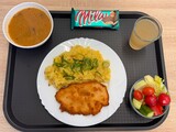 Polévka z hlívy ústřičné, kuřecí řízek, vídeňský salát, oplatka, zeleninový bar, mošt